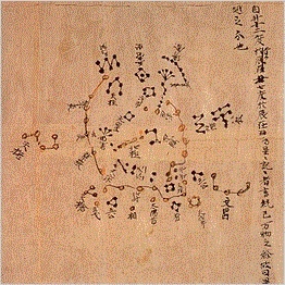 | 中国敦煌の星図 ―― 現存する最古の星図の 1 つ、 7 世紀のものと思われ、太陰暦の各月と北極星のあたりを示し、 全部で 1345 個の星と、257 の星座をはっきりマークし、名称を示す。 |