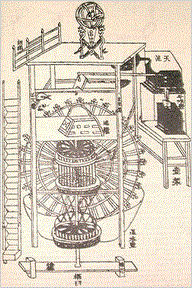 蘇頌の本の元々の図式、 彼の時計塔の内部の仕組みを示す。機械的に回転 する渾天儀が装置の頂上。 |