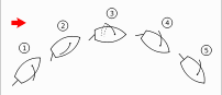 この操作で主帆 (mainsail, メインスル) はボートの中心を横断し、 ジブ (jib, 船首の三角帆) は ボートの反対側に引かれる。 もしも スピニカー (spinnaker) が上がっていれば、このポールを主帆の反対側のまゝにするために、 手で動かさなければならない。 ディンギー (dinghy) では、センターボード (centerboard) を持ち上げれば、 少々乱暴な操作で転覆の危険を増やす。 もっとも平坦で、 滑らかな船体のプロファイル (profile) では逆が正しい : センターボード (centeboard) を持ち上げると、 操作中に傾く時間 (heeling moment) が減少し、 従って転覆の危険を減らす。
