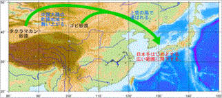 アジアの砂塵は中国本土の乾燥地帯で上昇し、 風に乗って、日本のような地域で降下する。 |