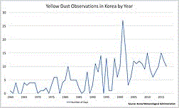 この半世紀に、アジアの砂塵の報告日数は 5 倍に増えた。 大韓民国気象庁 (Korea Meteorological Administration, KMA) のデータ解析では、 与えられた年のアジアの砂塵の平均日数は 1960 年代には 2 日であったが、 この数は 2000 年代には 11 日に増えた。 1960 年代と 1970 年代の各 10 年間にアジアの砂塵がない年は 3 年あった。 しかしながら 2000 年代以後は、アジアの砂塵がない年は 1 年もなかった。 2018 年のたった 4 ヶ月に、韓国 (South Korea) の 京畿道 (Gyeonggi Province) は 42 回の砂塵の警告と注意報を 公布し、これは 2017 年の同じ時期の 36 回から増大した。 これは平均的砂塵レベルの濃度の増加 ―― 2017 年には 132.88 ppm (perts per million) から 2018 年の 149 ppm ―― を反映している。 砂塵微粒子は大気に長く滞在するため、状況は悪化している。 平均継続時間は最近 2 年間に 16.3 時間から 19.8 時間に増大した。