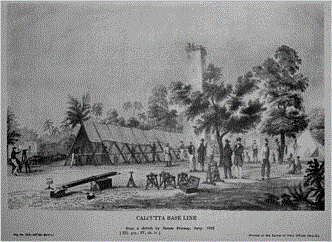 | 天頂セクター (zenith sector) は上向きの望遠鏡で 正確な角度目盛りが付いている。 赤緯が既知の天頂近くの星が 緯度決定に使用される。北極星の直接測定は 大気差により影響があり得る。 | 1832 年のカルカッタ基線の測定、 ジェームズ・プリンセプ のスケッチ。杭で支えた格間の上のチェーンを測量技師が広げる。 チェーンは熱膨張によるエラーを削減するために日陰に格納し、 水準望遠鏡を使用して向きを揃える。 |