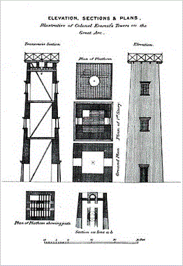 | ジョージ・エベレスト (George Everest) により使用された測量塔。 機器を持ち上げる | コルカタ (Kolkata) の測量塔の 1 つ、2012 年 |