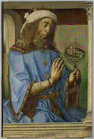 渾天儀のモデルを持つプトレマイオス、 ヨース・ファン・ワッセンホフ (Joos van Ghent) と ペドロ・ベルゲーテ (Pedro Berruguete) 作、 1476 年、パリのルーブル博物館 |