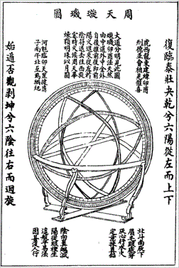中国の歴史を通して、天文学者は 天球儀 (celestial globes, 中国語 : 渾象; pinyin: húnxiàng) を作り、星の観測を支援した。 中国人は暦の評価と計算の助けに渾天儀も使用した。