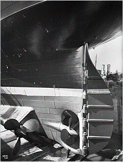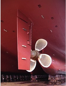 現代の船のラダー (スクリューの後の背の高い長方形) |