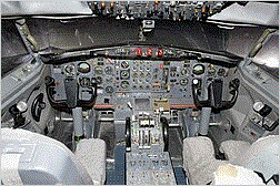 ラダーは操縦桿の底部後方のラダー・ペダルで 制御。 ボーイング 727 のコックピットの写真 |
