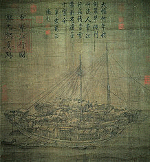 宋 (960 年-1279 年) 初期の絹に描かれた絵 二隻の貨物船に小さな船が随行。 郭忠恕の絵 手前に見える船の大きな船尾ラダーに着目 |