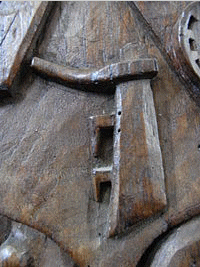 | 「舵針と受けの付いたラダー」, ハンザ同盟 の旗艦 アドラー・フォン・リューベック (Adler von Lübeck) (1567 年-1581 年) 当時, 世界最大の船 | 船のラダーが オーク材に彫刻、15 C 頃。 デヴォン (Devon) の バー・フェラーズ (Bere Ferrers) 教会。 Cheyne 家と Willoughby 家の紋章 |