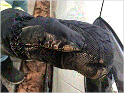 手袋の上のベージュの砂塵、 グルノーブルの戸外の壁を拭いた後 |