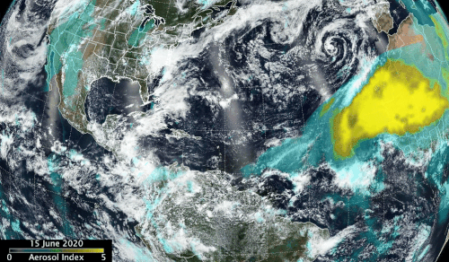 | 2020 年 6 月 15 日から 25 日の大西洋にわたるサハラ砂漠の砂塵は OMPS エアロゾル・インデックス と NASA/NOAA の Suomi NPP 衛星からの VIIRS 可視画像の合成、 Colin Seftor 作、 |