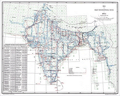1600 年の開始から 19 世紀始めまでの、全インド亜大陸の支配まで、 英国東インド会社はますます領土を獲得した。 新しい領土を獲得すると、会社は何人かの探検家と地図製作者を採用して、 その領土で地図などの情報提供をさせた。もっとも有名なのは 1767 年のベンガルの ジェームス・レネル (James Rennell)である。 レネルが前進して地図を作るにつれ、正確な測定がないことに気が付いた。 1800 年に、会社が ティプー・スルターン (Tipu Sultan) に勝利したすぐ後に、測量経験のある歩兵隊の兵士であるウィリアム・ラムトン (William Lambton) は 一連の三角測量を通して、これを正確に改善することを提案し、 当初は獲得した マイソール王国 (Mysore) の領地で、そのうち亜大陸全体で実施することとした。