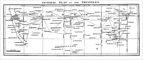 インドの大三角測量は 1802 年 4 月 10 日に マドラス (Madras) の 近くの基線 (baseline) で開始した。 ラムトン (Lambton) 少佐は 北端に聖トーマス山 (St. Thomas Mount)、 南端に Perumbank hill がある平坦な平野を選択した。 基線は長さ 7.5 マイル (12.1 km) であった。 Tellicherry と カンヌール (Cannanroe) の海岸地点を接続できるように、ケイター (Kater) 中尉が 西の丘の高い見晴らしのい地点を見つけるために派遣された。 選択された高い丘はデリー山 (Mount Delly) と Tadiandamol であった。 海岸から海岸への距離は 360 マイル (580 km) で、この測量線は 1806 年に完成した。 東インド会社はこの計画にはおよそ 5 年かかると考えたが、70 年近くもかかり、 1857 年の インド大反乱とインドにおける会社の終焉をとうに過ぎていた。 測量すべき土地の広さから、測量技師はインド全体の三角測量をせずに、 彼らが、東西南北に走る三角測量鎖の「格子」(gridiron) と呼ぶものを測量した。 時には測量チームは 700 人になった。