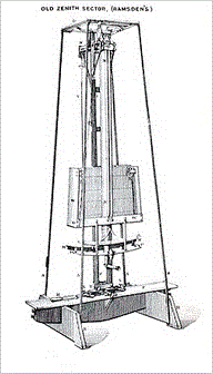 | 天頂セクター (zenith sector) は上向きの望遠鏡で 正確な角度目盛りが付いている。 赤緯が既知の天頂近くの星が 緯度決定に使用される。北極星の直接測定は 大気差により影響があり得る。 | 1832 年のカルカッタ基線の測定、 ジェームズ・プリンセプ のスケッチ。杭で支えた格間の上のチェーンを測量技師が広げる。 チェーンは熱膨張によるエラーを削減するために日陰に格納し、 水準望遠鏡を使用して向きを揃える。 |